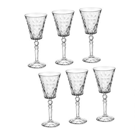 Описание: Чаши: Ø 9.0 см. Височина: 21.0 см. Вместимост: 260 мл. Стилен комплект от 6 чаши за вино, произведени от италианската фирма RCR Crystal. Чашите създават усещане за наслада от вкуса на виното с нестандартната си форма и изящен дизайн. Подходящи за почистване в съдомиялна машина. Подарете си финес и красота на масата с италианско качество.
