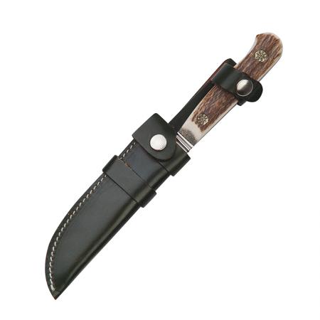 Описание: Ловен нож с дръжка от елен. Калъф от естествена кожа. Размери: тегло: 131 гр; обща дължина: 219 mm; дължина острие: 105 mm; дебелина острие: 3,9 mm. Острие: ATS 34 Nicker. Произход : Германия