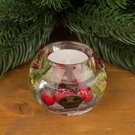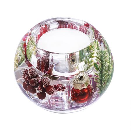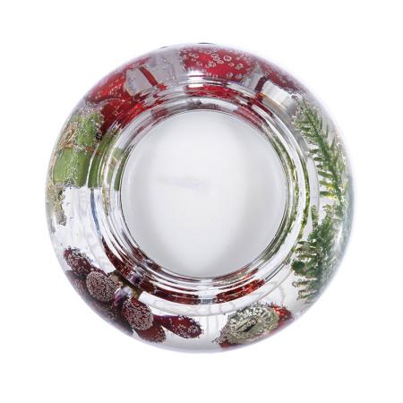Описание: Стъклен свещник с красива коледна вътрешна декорация. Включва чаена свещ. Размери: 5 х 7 см.