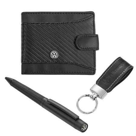 Продукти КОЖЕНИ ИЗДЕЛИЯ Луксозни подаръчни комплекти Мъжки комплект химикалка, портфейл и ключодържател Auto Set с логото на Volkswagen