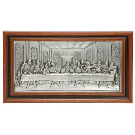 Описание: Картина, изобразяваща творбата „Тайната вечеря“ от Леонардо да Винчи. Картината е изящно изработена върху сребърен лист проба 925 с ъс солидна дървена рамка. Предлага в бяла картонена кутия Произведен в Португалия от „Freitas & Dores“. Размери: 60 * 40