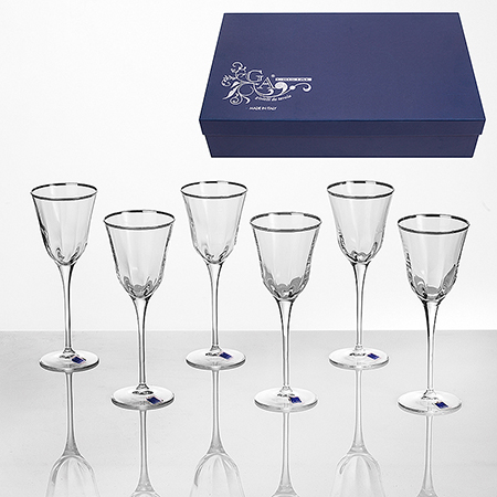 Описание: Италиански сервиз от 6 чаши за червено вино с фино прилепнал ринг около ръба на чашата, който придава изящен завършек на нейната форма. Визията се допълва от луксозна кутия в тъмно син цвят. Перфектен подарък за ценителите на червеното вино. Размери: Чаши: Ø 8,2 см. Височина: 22 см. Вместимост: 200 мл. За да се запази красотата на чашите, се препоръчва ръчно почистване. Материал: кристалин 2,45 % плътност.