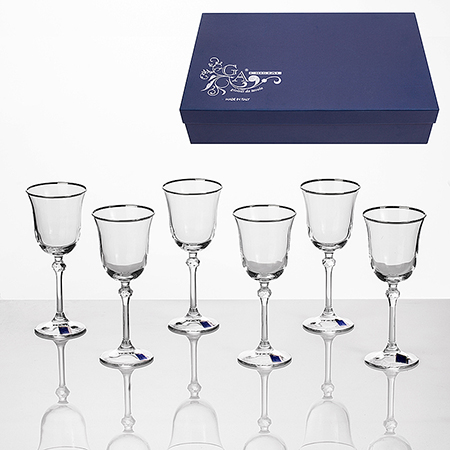 Описание: Чаши: Ø 8 см. Височина: 20 см. Вместимост: 200 мл. Италиански сервиз от 6 чаши за бяло вино с фино прилепнал ринг около ръба на чашата, който придава изящен завършек на нейната форма. Перфектен подарък за ценителите на виното. Визията се допълва от луксозна кутия в тъмно син цвят с размери: 44,5 см. дължина; 26,5 см. ширина; височина 10 см. За да се запази красотата на чашите, се препоръчва ръчно почистване. Материал: кристалин 2,45 % плътност.