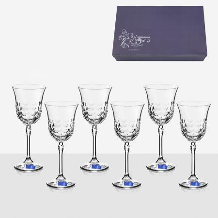 Описание: Чаши: Ø 8 см. Височина: 20см. Италиански сервиз от 6 чаши за червено вино с изящна форма, нежно изработени от фино стъкло с елегантни украсителни елементи по дъното и столчето на чашите, което придава красота и изящен завършек на формата. Визията се допълва от луксозна кутия в тъмно син цвят с размери: 45 см. дължина; 27 см. ширина; височина 10 см. За да се запази красотата на чашите, се препоръчва ръчно почистване. Материал: кристалин 2,45 % плътност.