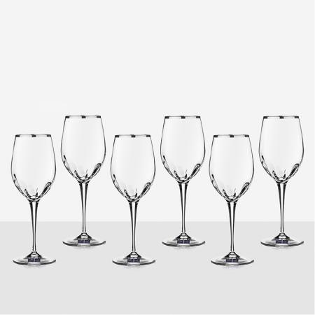 Описание: Чаши: Ø 6 см. Височина: 22,5 см. Вместимост: 330 мл. Кутия: дължина 44,5 см. ; ширина 26,5 см. ; височина 10 см. Италиански сервиз от 6 чаши за червено вино с фино прилепнал ринг около ръба на чашата, който придава изящен завършек на нейната форма. Визията се допълва от луксозна кутия в тъмно син цвят. Перфектен подарък за ценителите на червеното вино. Препоръчва се ръчно почистване. Материал: кристалин 2,45 % плътност.