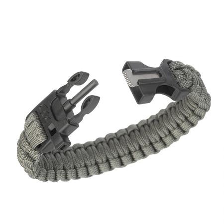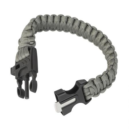 Описание: Текстилна гривна с пвц закопчалка, в която има вградена свирка и магнезиева запалка. Дължина: 23 см . Цвят: сив